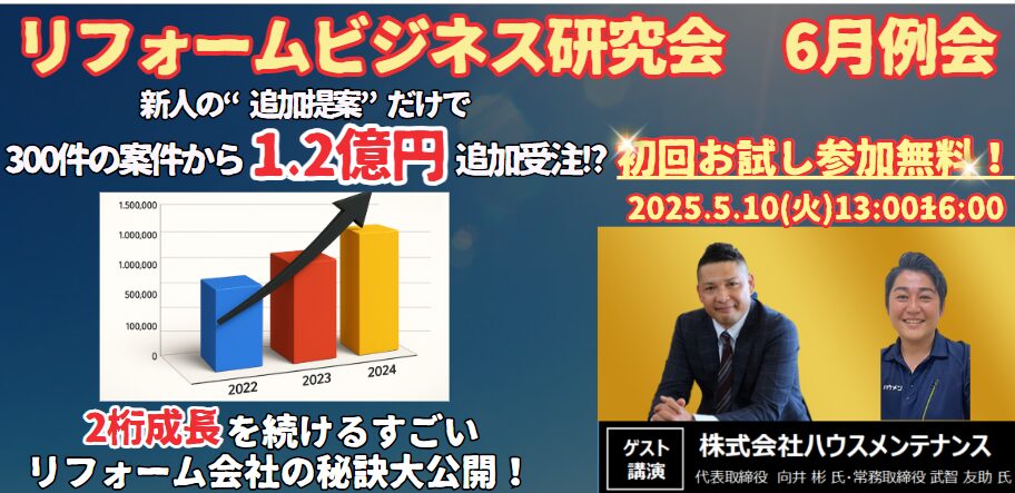 全国150社のリフォーム会社が入会中の「リフォームビジネス研究会」|2025年6月度のメインテーマは「追加受注・トスアップ営業で外壁・屋根リフォームの受注が急成長した会社の取り組み」