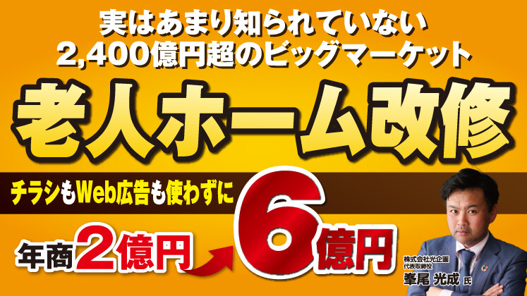 この度、ゲスト講師として株式会社光企画の峯尾光成氏が、この老人ホーム改修ビジネスの立ち上げ方と成功の秘訣を解説するオンラインセミナーを開催します。